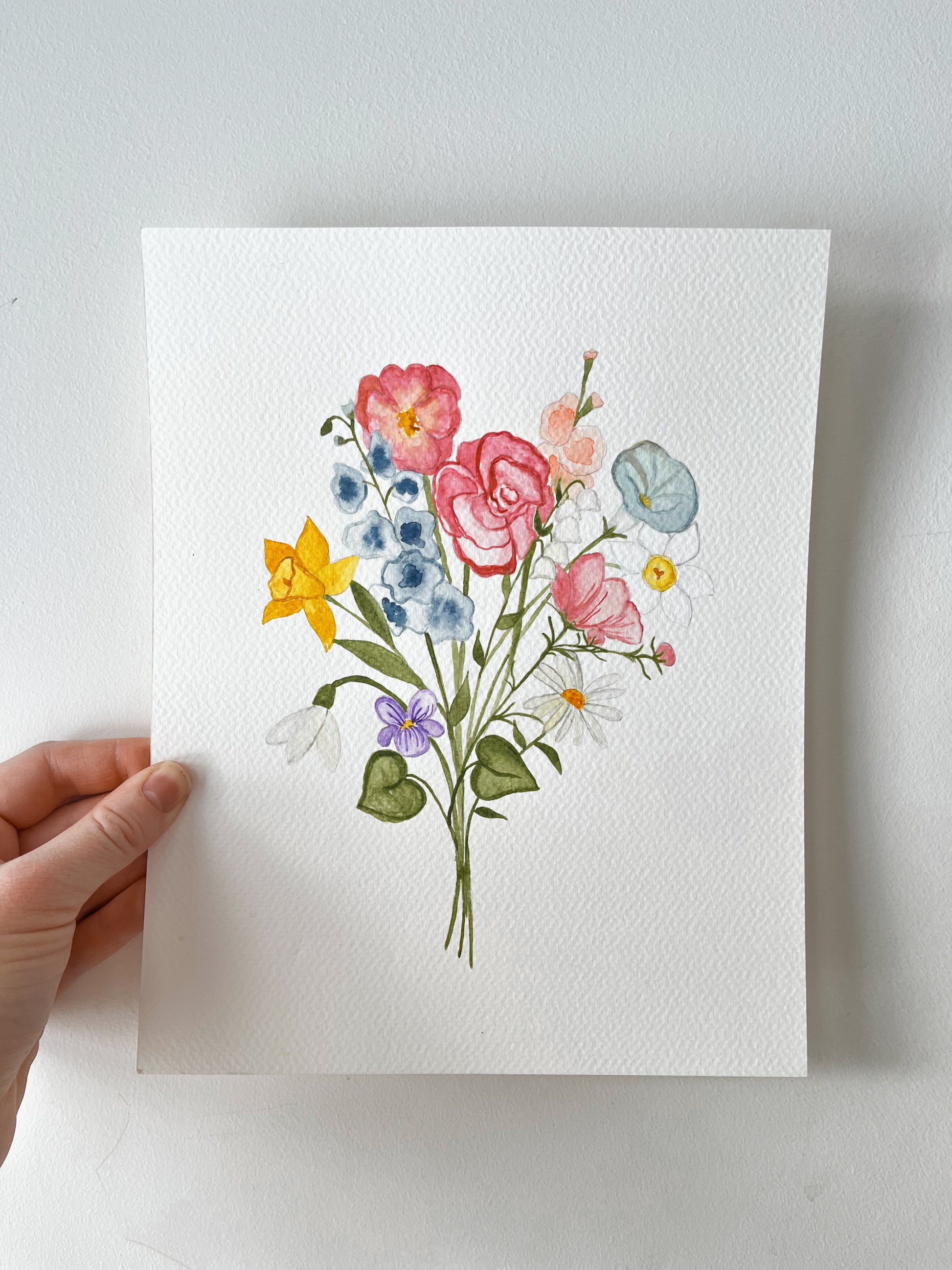 My custom birth flower bouquet paintings combine the birth flowers of your loved ones into a single, beautiful arrangement. Each piece is hand-painted and personalized, making it a meaningful gift for parents, grandparents, anniversaries, Mother’s Day, or just because. Unframed 8x10" on high quality watercolor paper.